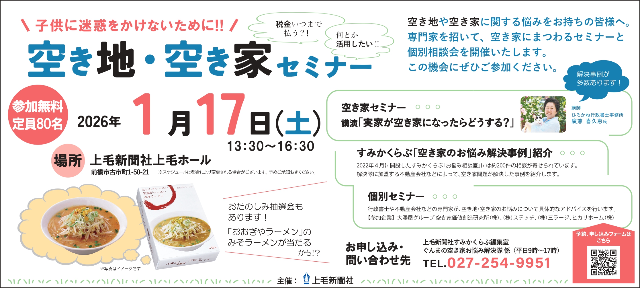 上毛新聞社すみかくらぶ編集室の「空き地・空き家セミナー」が1月17日、前橋市古市町の同社上毛ホールで開かれる。