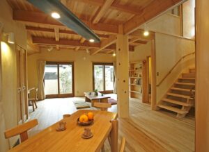 檜の床と杉の勾配天井に珪砂(けいさ)漆喰の塗り壁が調和する、自然素材のぬくもりに満たされた居住空間。玄関と居室を仕切る壁の両側には、緩やかな曲線のアール壁を施した。OMソーラーを導入し、上下の階層をルーバーがつないで温度差のない居住空間を創出する。