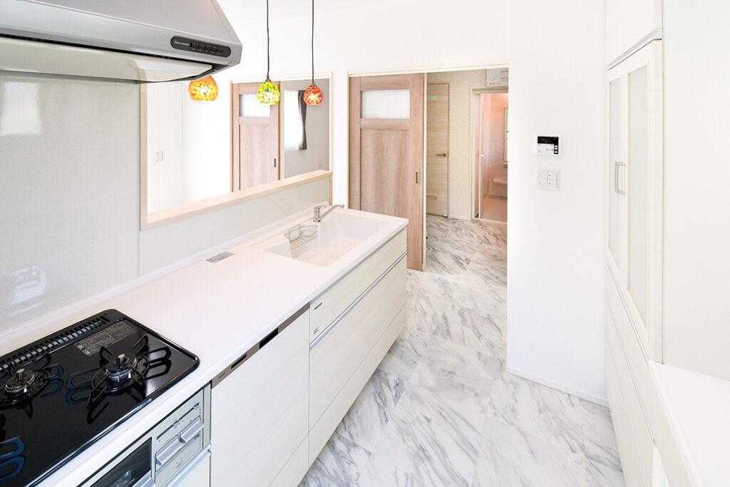 玄関脇の扉を開けるとLDK。仕切りとなる曇りガラス風の吊り戸から差し込む柔らかな光と、床一面に広がる大理石風のフローリングが12畳以上の広さを感じさせる。