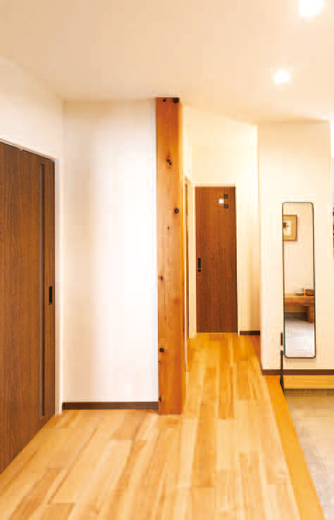 Sさん夫妻にとって2度目となる新居は、敷地内に隣接する子世帯の家から中庭を挟んで建ち、ほどよい距離感が保たれている。家づくりの依頼先は「在来骨太住宅」を掲げる山崎工務店。木をふんだんに用い、がっしりとした構造が現しとなった同社の和のモデルハウスを見学したご主人は「ひと目で気に入った」と振り返る。特に吹き抜けの天井に架けられた、存在感のある古材の梁が決め手になったという。