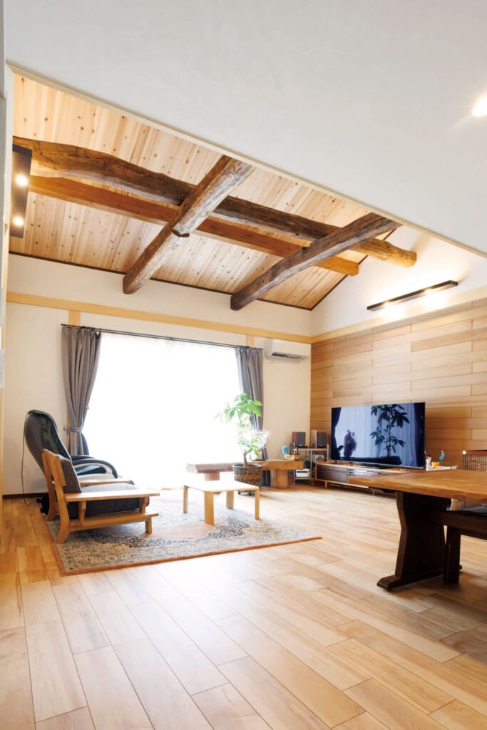 玄関に入ると木の香りがほのかに漂い、ホールの横には整然とした和室が備わる。正面の扉を開けると開放的なLDKが現れる。ワンフロアの空間は、カエデの無垢フローリングを張った床とコテむら仕上げの塗り壁が調和し、そこに以前から愛用していたお気に入りの木製家具が配置されている。高さのある勾配天井を見上げると、ご主人の要望した古材を用いた梁が、圧倒的な存在感を放っている。