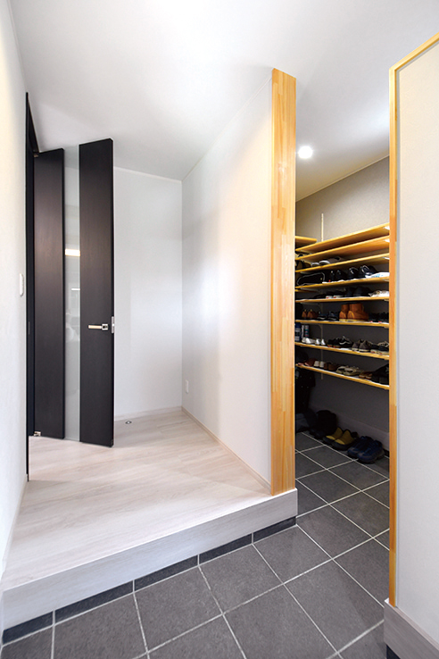 完成したH邸は、玄関に可動棚付きの土間収納が備わる。開放感たっぷりの30畳ワンフロアでのびのびとした空間を実現。L字に配置したLDKの動線は使いやすく機能的に回遊できる。廊下はなく、ダイニングキッチンの裏手に浴室、洗面脱衣室、ランドリールームが一直線に並び、LDKから扉ひとつで主寝室や子ども部屋にもつながる。