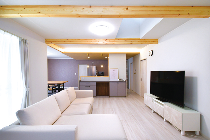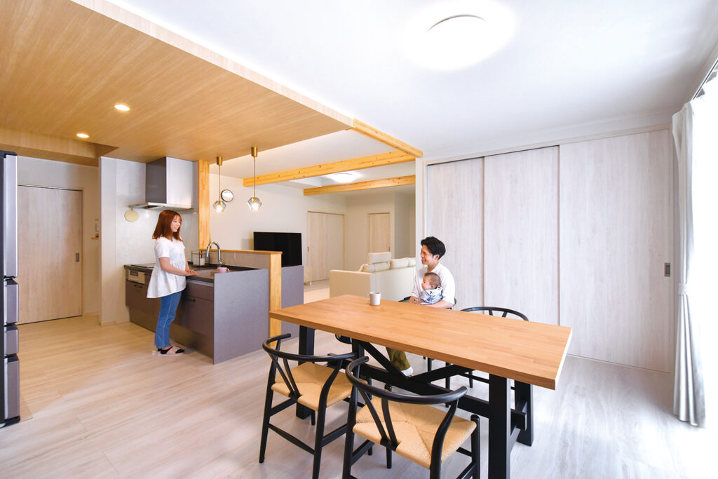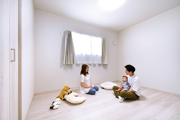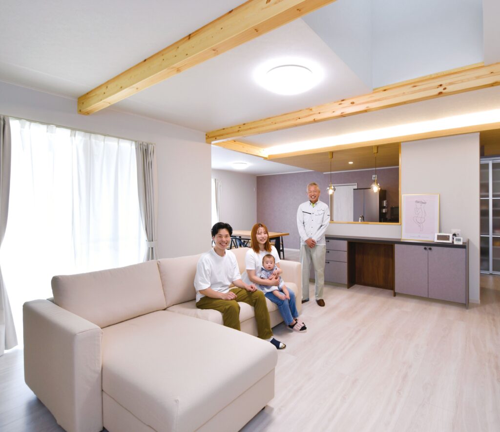「広いリビングで暮らしたい」。ご夫妻は、子どもを授かりアパートが手狭になったことを契機に、マイホームの取得に動き出した。まずは大手住宅展示場の見学から。その後、職場の同僚が新築したという大竹住建のホームページを検索。そこで「自由設計」かつ「エコ住宅」の家づくりに興味を持ち、同社を訪問した。決め手となったのは大竹博之社長の人柄。親身に施主に寄り添う姿勢に、ご夫妻は安心と信頼を寄せた。