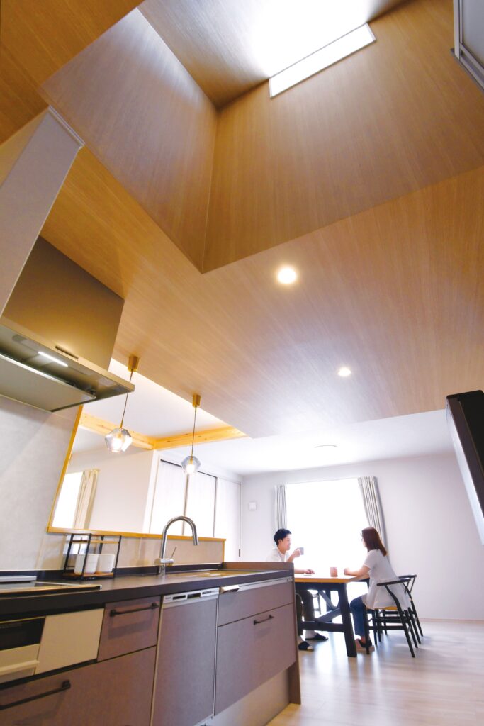 リビングとキッチンの2か所に設けたトップライトの採光が、ニュアンスカラーでコーディネートした居住空間の隅々に明るさを届ける。内装を選んだのは奥さま。壁紙には淡いグレーを、キッチンの壁面はグレーの濃色でアクセント。床材や建具もライトカラーでなじませた。ご主人のお気に入りはキッチンの折下げ天井に沿わせた間接照明。ソファでくつろぐ時、天井が優しく照らされて陰影がきれいだという。住み始めて3か月、エアコンの設置はこれから。今現在は暑さ寒さが気にならず快適に過ごしているそう。「居心地のいい空間で子どもが健やかに育ってくれたら」と、ご夫妻は家族の未来に思いを寄せた。
