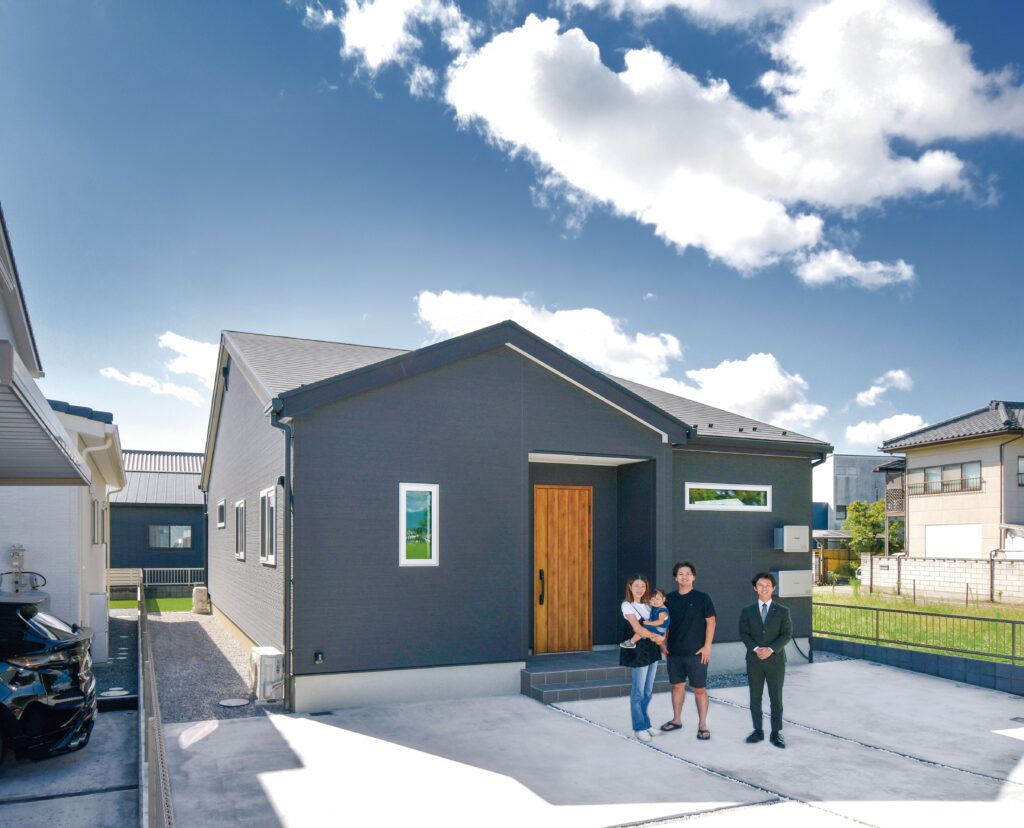 南北に長い敷地に建つ黒い外観のF邸。北側からのアプローチで温かみのある玄関ドアがアクセントの平屋住宅だ。 Fさんご夫妻の家づくりは、当時住んでいたアパートの近くでヤマト住建のイベントがあり、たまたま参加したことが始まり。「漠然と家は建てたいと思っていたけれど、何から始めたらいいのか分からなかった。イベントがいいきっかけになった」と振り返る。