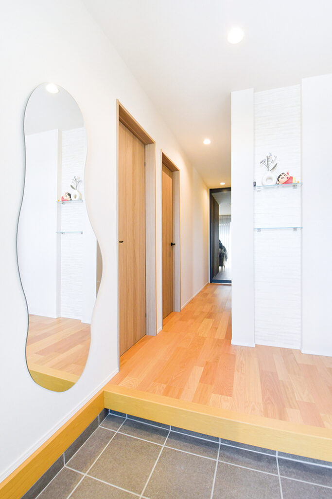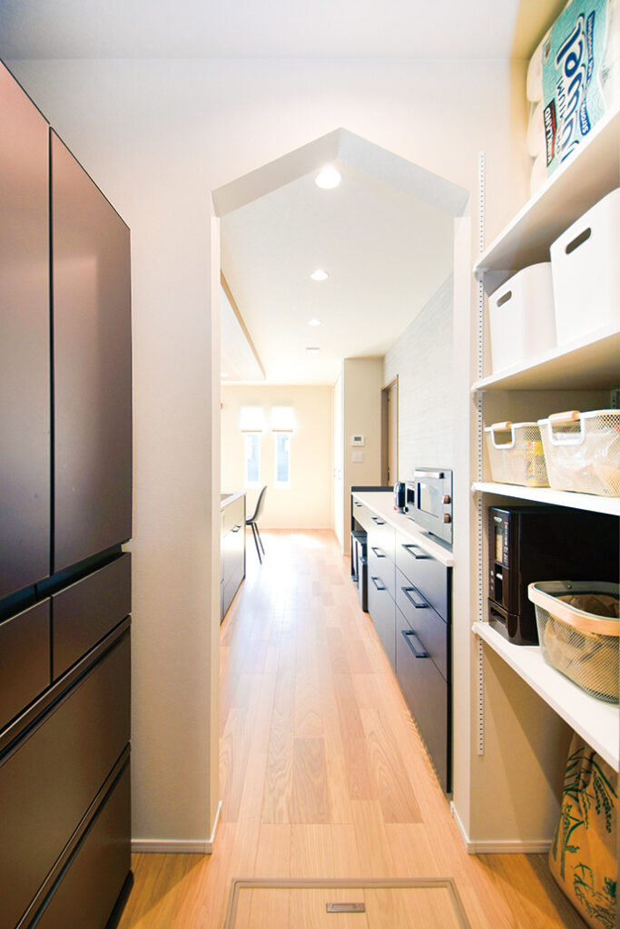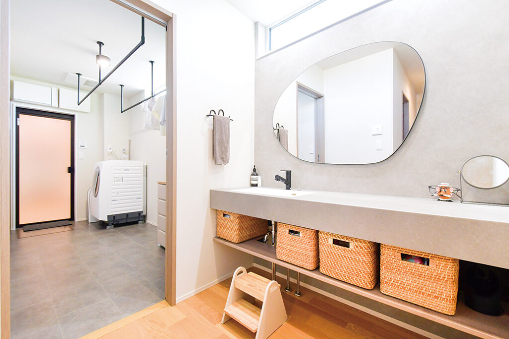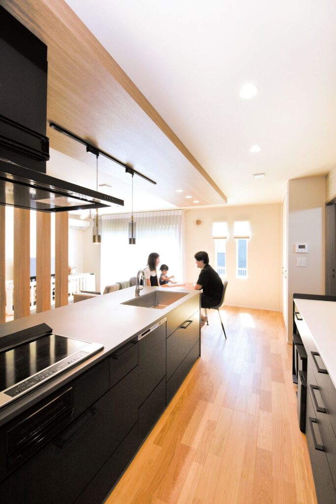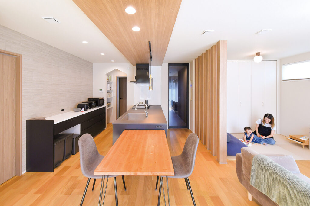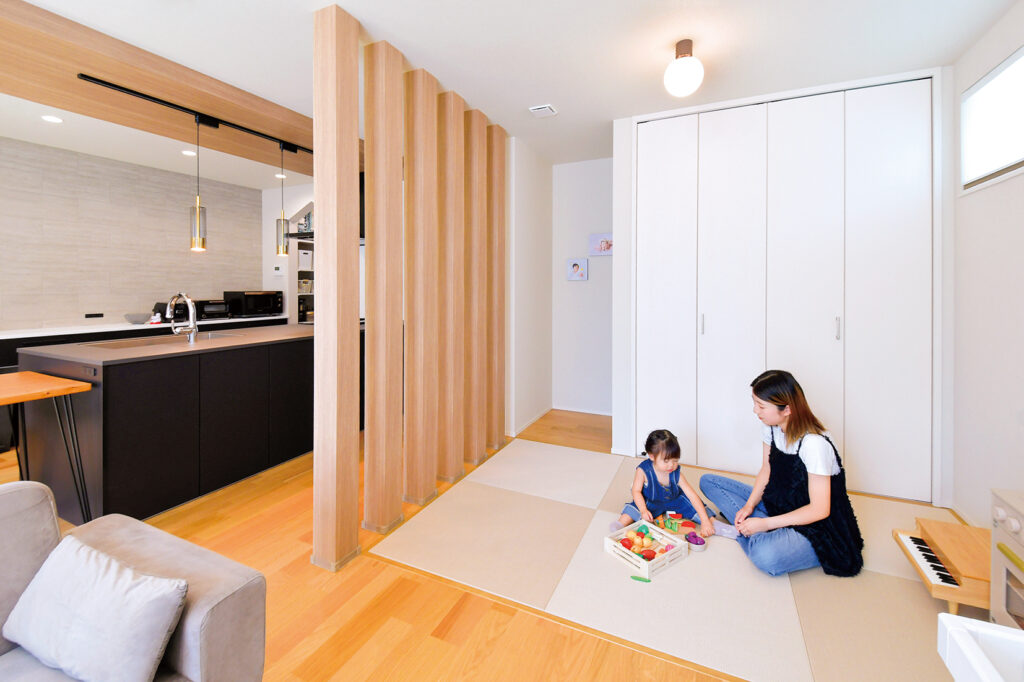 デザインを重視した奥さま。明るくナチュラルな室内にアクセントでグレージュカラーを取り入れた。敷地の細長い形状を生かした間取りは、プライベート空間を手前に配置。玄関に入ると子ども部屋と寝室が左右に現れ、廊下を抜けた先に家族が集うワンフロアのLDKが広がる。アイランドキッチンをゆったり中心に据え、そこから収納や水まわりへ動線が行き止まりなく回遊する。「子どもがグルグル走り回っています」と奥さま。リビングのコーナーには畳スペースを設けた。構造上必要となる1本の柱を格子状にアレンジしたことで、広い空間にメリハリとゾーニング効果が生まれた。