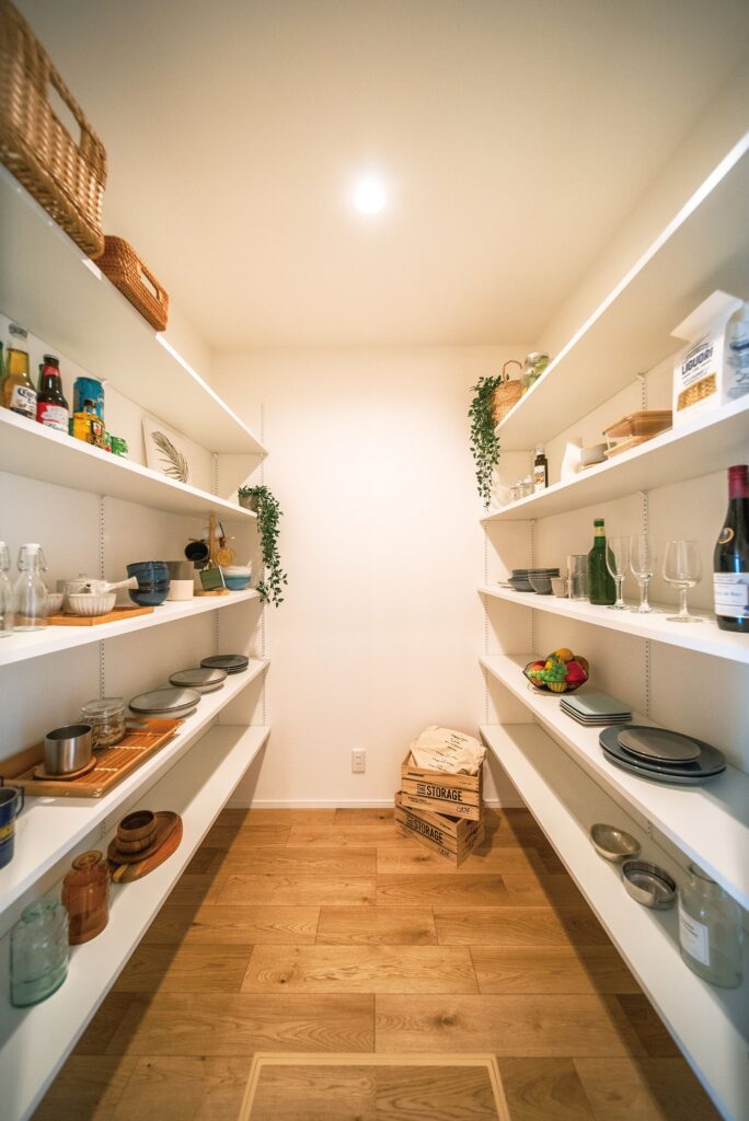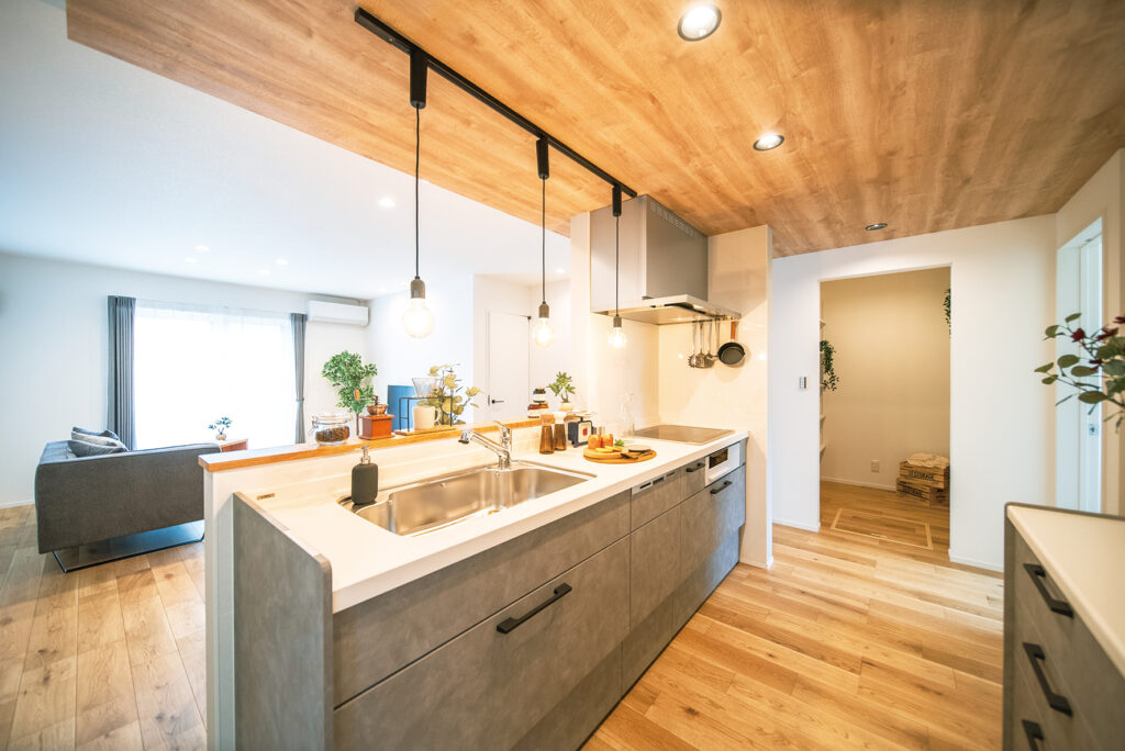 S邸は、キッチンを中心に動線が行き止まりなく巡る、家事に便利なワンフロア。コンパクトにまとまった水まわりや、収納力豊富なパントリーがキッチンの両サイドに備わる。白を基調とした明るいLDKは、家族が自然と集うシンプルで居心地のいい空間。床や天井の木目とグレーのキッチンやアクセントウォールが見事に調和している。