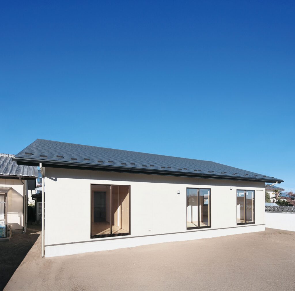 完成してまだ間もないN邸は、延床30坪の平屋住宅。落ち着きのある明るいブラウン系の外壁が、残された旧家の庭の植栽や塀と調和している。