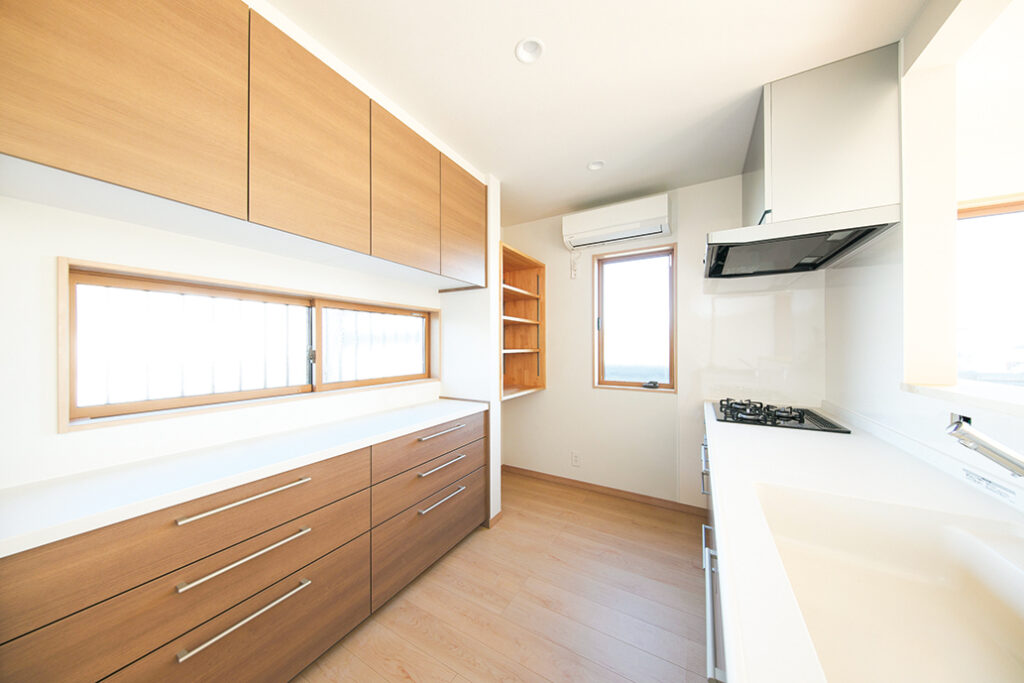 「間取りは旧家とほぼ同じなんです」と奥さま。住み慣れた動線を優先し、キッチンもまた使い慣れたガス火を採用した。これから家具や暮らしの道具を配置して新居で年越しを迎える予定。「平屋だからこれで老後も安心です。のんびり仲良く過ごしたいですね」。