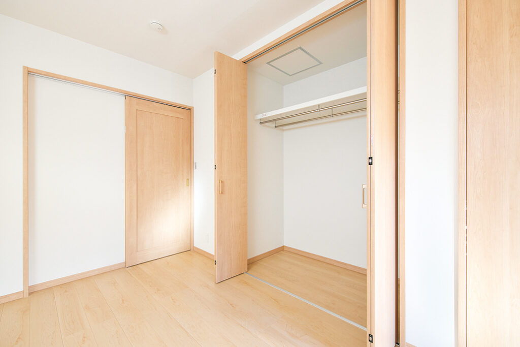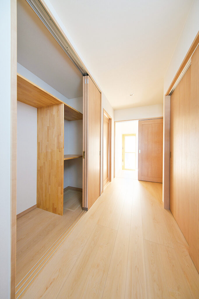 ご夫妻が希望したのは、明るさと暖かさ、そしてバリアフリーへの配慮。北側の玄関ドアを開けると、ゆったりとした廊下が左右に広がり、その両サイドには収納が充実している。トイレ以外、扉はすべて引き戸を使用。ご夫妻が多くの時間を過ごすワンフロアのLDKには7.5畳の和室を併設し、引き戸を開放すれば空間が連続する。
