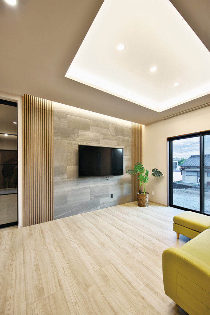 写真は、子育て世代の平屋の住まい。収納の位置と容量を意識してスムーズな生活動線を目指したという施主。間接照明やダウンライトの配置にもこだわった。