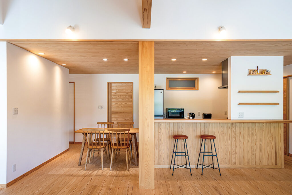 「良質な素材は家を長持ちさせる」という信念のもと、厳選した自然素材を用い、確かな職人技術で「本物の木の家」を造る松浪建設。創業以来こだわり続けるのは、100%国産無垢材を利用してCO削減に貢献すること。柱と土台に檜4寸角、大黒柱は檜8寸角、床材には厚さ30・の杉板を使用。合板フローリングは一切使わない。檜には高い耐久性と抗菌作用があり、さらに杉も檜も調湿効果に優れる。歴史的建造物がそうであるように、日本の気候風土に適しているからだ。