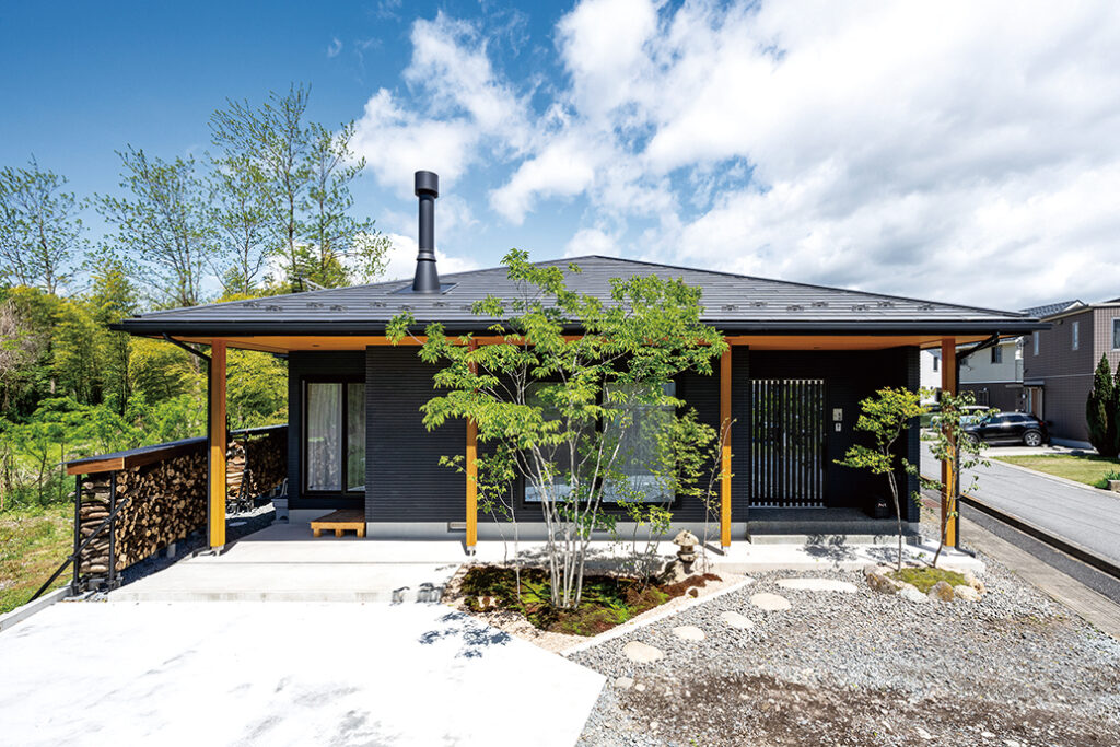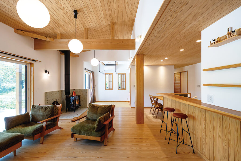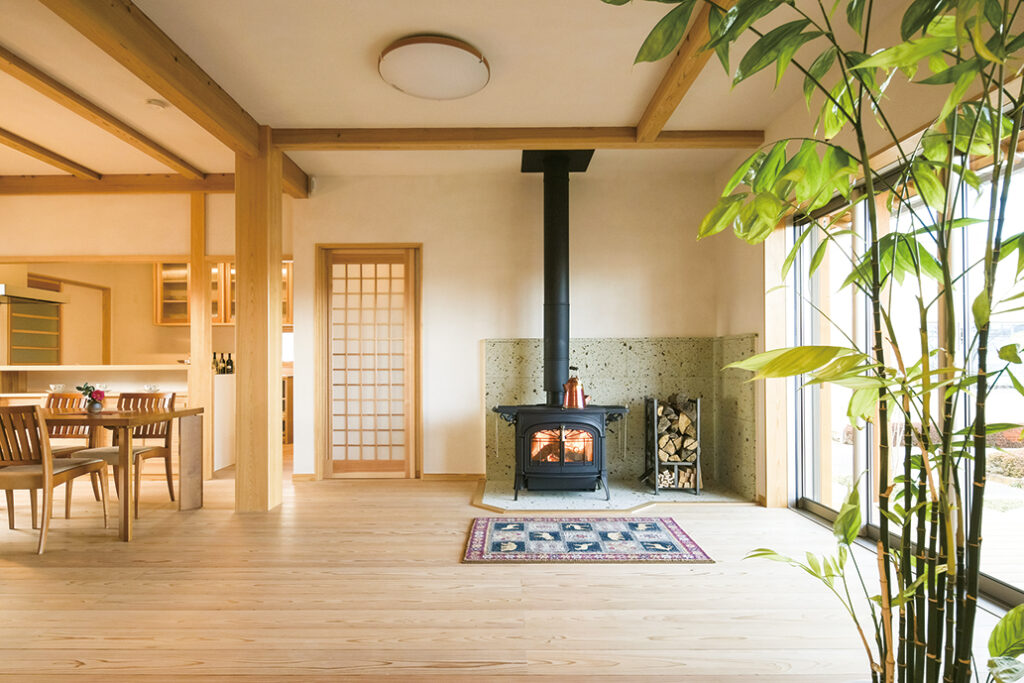 事務所併設のモデルハウスは自然素材にこだわった上質な和モダンスタイル。リビングには薪ストーブを導入し、無垢材と漆喰に包まれた吹き抜け空間との相性も良く、心地よい暖かさと火のある豊かな暮らしを提案する。既製品に頼らず、職人による丹念な造作も見どころの一つだ。