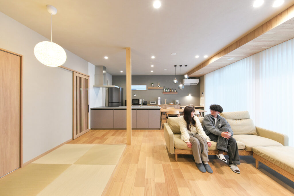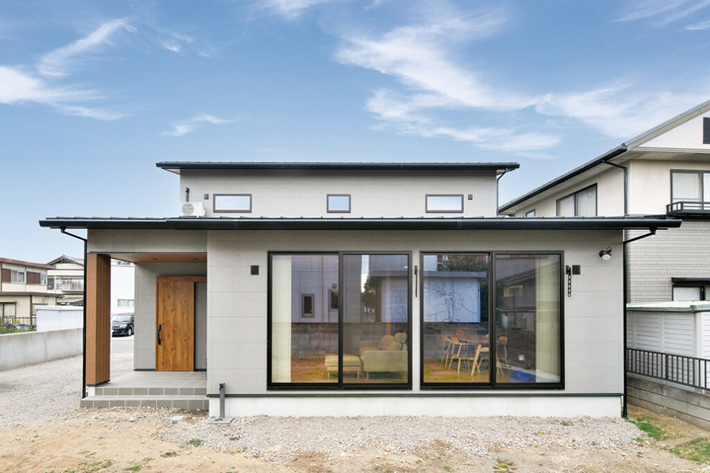 1階だけで暮らしが成立する平屋ベースの2階建て。リビング空間は施主のこだわりが満載。ジャパンディスタイルをコンセプトにグレーの濃淡の壁と木部を調和させ、南面には開放的な大開口を配置し、折り下げ天井にスピーカーを内蔵。ペンダント照明が空間を彩る。