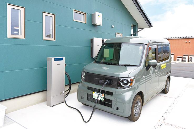 モスグリーンの色が目を引くモデルハウスの外観。早くも見学者から「おしゃれな色」と好評だ。招き屋根には太陽光パネル11.76㌗を搭載し、駐車スペースにはEV車の充電スタンドも装備した。