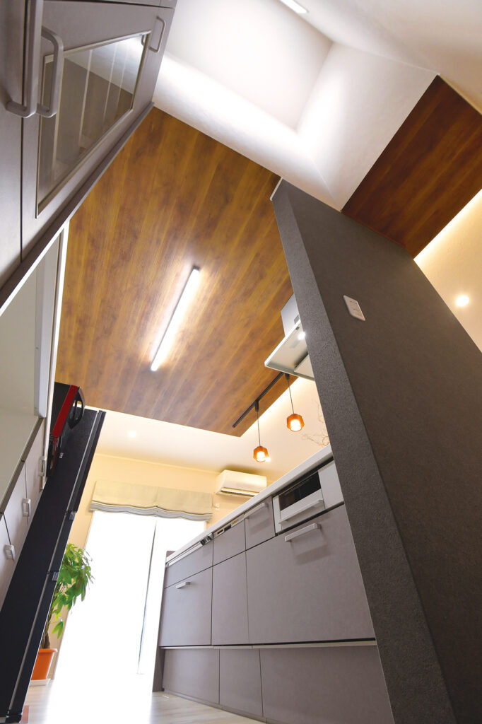 室内は廊下のないワンフロアのLDKに小上がりの和室を付設。キッチンの背面にランドリールームや脱衣室が配置され、キッチンを中心とした家事に便利な回遊動線が特徴だ。天窓から柔らかな光がフロアに差し込み、白い壁面を明るく照らす。自然光や照明などの光源によってクロスの色調が緩やかに変化していく。玄関収納やファミリークロゼットなど充実した収納スペースも各所に備わる。