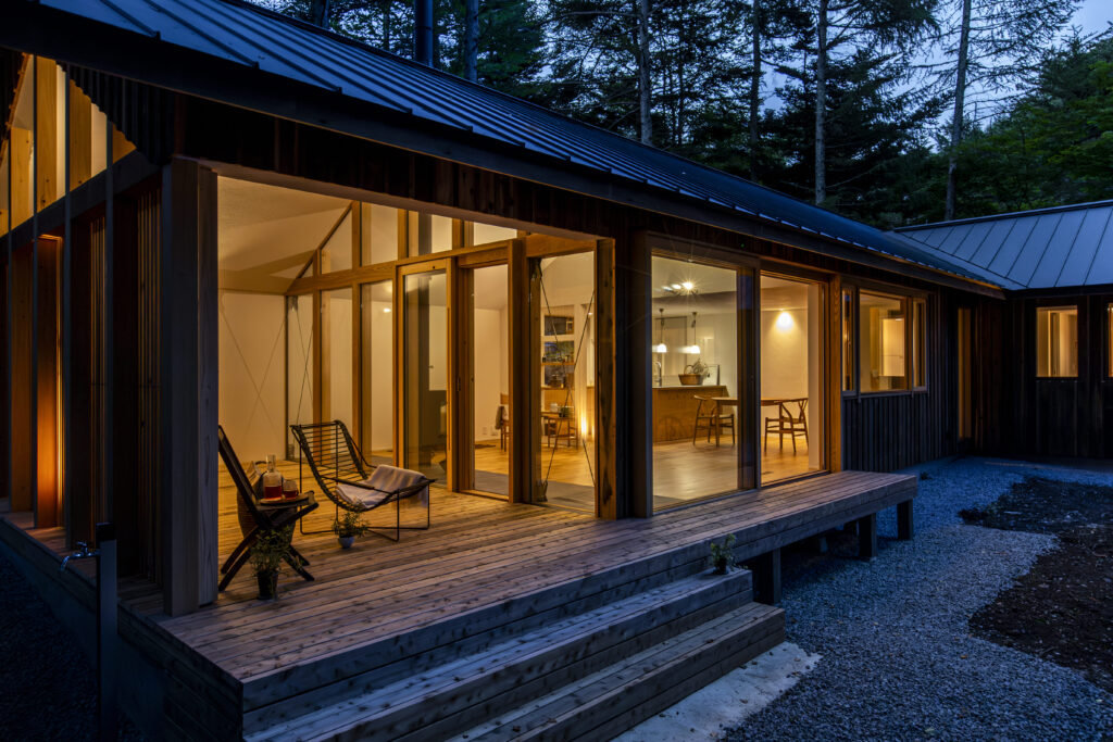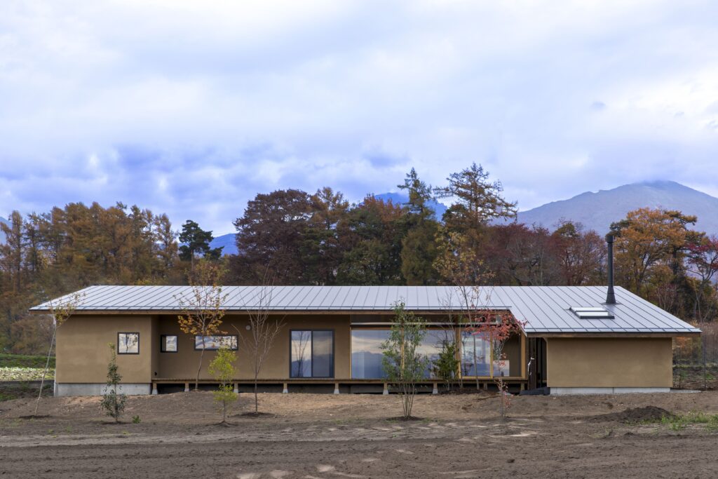 モデルハウス(長野県坂城町)は、大きな窓で庭とのつながりを意識し、室内は壁で仕切らずに開放感のある空間に仕上げた。