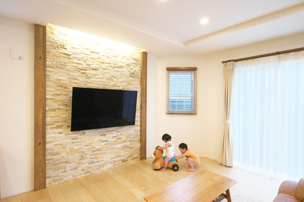 アーリーアメリカンスタイルを取り入れたアイボリーの外観は、おしゃれで素朴な風合いを感じさせる。大きな木目調の観音開き扉が擬岩の外壁を伴ってアクセントになっている。太陽光発電を導入したZEH住宅で、快適性能を備えながら光熱費を節約する。「思っていた以上の出来で申し分ありません」。Iさんご夫妻は、多くの要望をかなえた自慢の家で子ども2人と暮らす日々を満喫している。