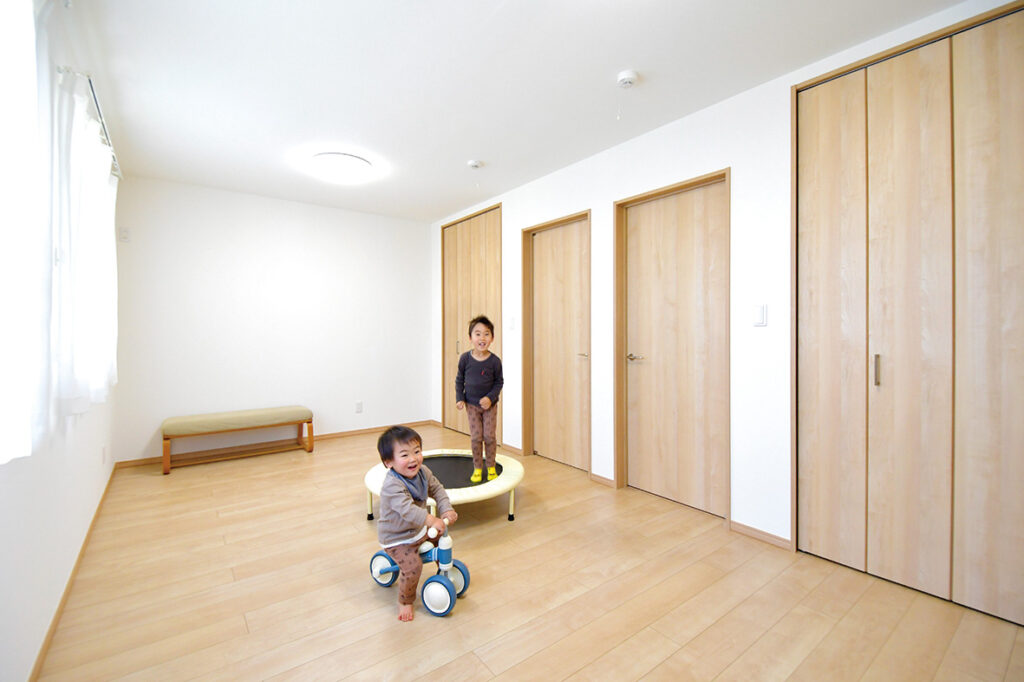 2階には、主寝室とご主人の書斎、子ども部屋を配置。子ども部屋は、個室が欲しくなったら2間に区切れるように、ドアと収納を2つずつ設けた。今は1間で広々としているので、兄弟が元気に走り回っている。