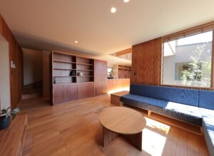 ちょっとした中庭を設けることで、風が通り抜ける平屋が出来ました。 LDKは天井・壁は杉材で仕上げ、一部障子も設けることで和モダンな空間になりました。 南側の通りに面した窓は小さくし、北側を大きくし、北側の大きな庭を植栽で仕上げることで落ち着いた空間になるように考えています。