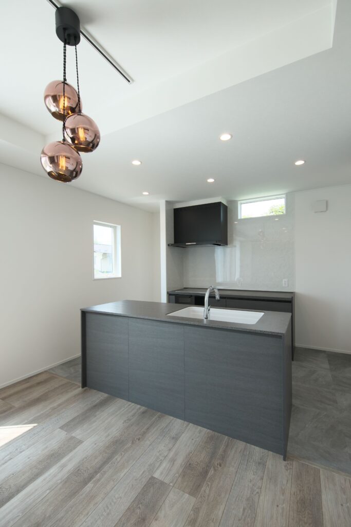 屋内の各所に光を届ける高窓を効果的に用いている。玄関ホールにつながるリビングの扉には、色ガラスのハイドアを採用した。ダイニングの照明は施主自らが探し、こだわったアイテムの1つ。モノトーンの空間をモダンに演出している。