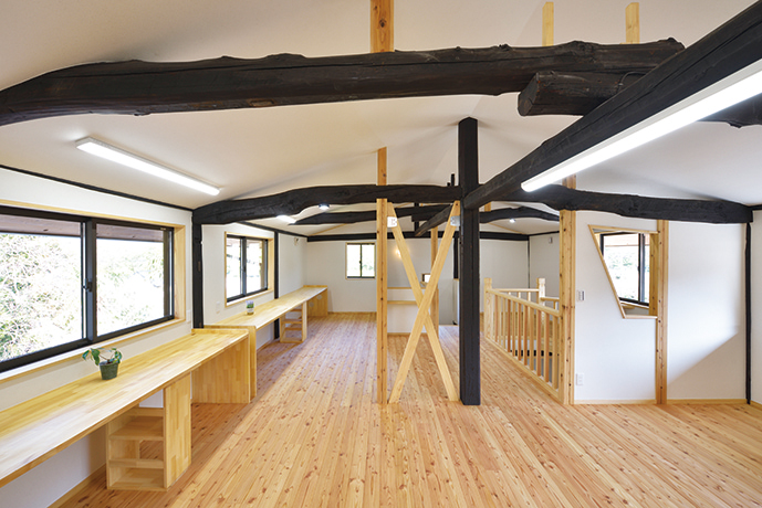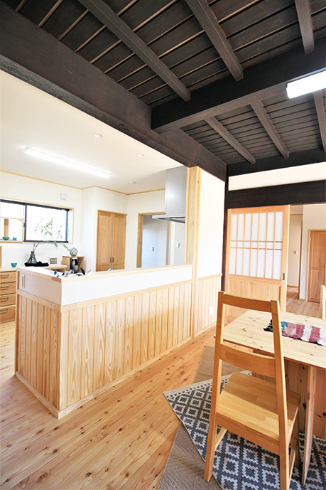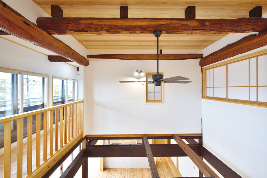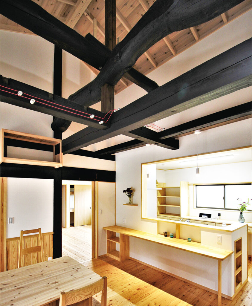 その上で古民家の弱点である「暗い・寒い・使いづらい」を解消できるよう、耐震補強や断熱改修を行いつつ、大きな吹き抜けをつくり、採光性や風の流れにも留意して快適空間に生まれ変わらせる。梁や大黒柱をそのまま現しにして大胆な空間を表現する。近年の家族形態に合わせ、30坪程度の平屋に減築することもある。