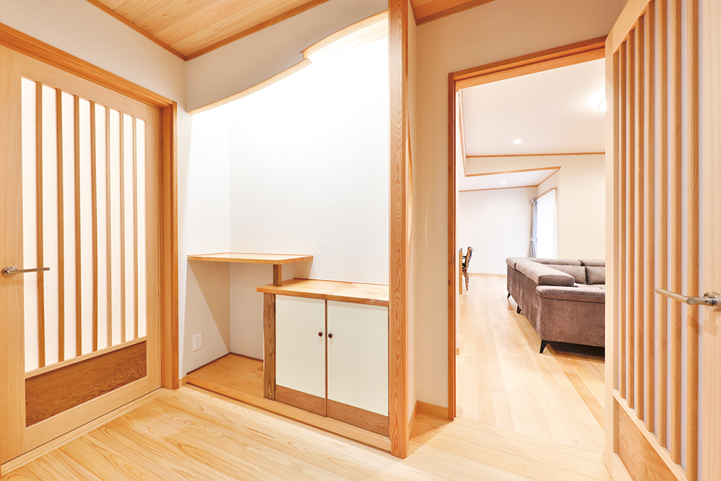 「良い家づくりは、良い素材選びから」を信条とし、自然素材でつくる上質な和モダン住宅は同社の代名詞と言える。使用するのは、十分に乾燥させた無垢材をはじめ、珪藻土や漆喰、和紙などの呼吸する自然素材。断熱材には古紙を利用したセルロースファイバーを用い、高い断熱性能と調湿、防音効果を発揮する。