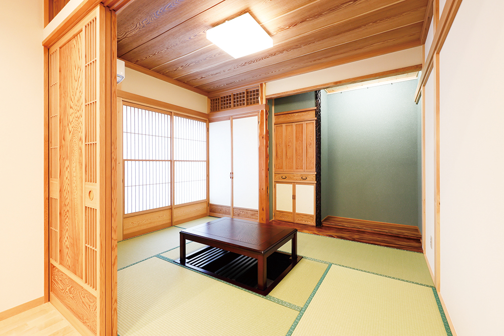 自社倉庫には豊富な木材が眠り、希少性の高い銘木を建具や室内装飾に惜しみなく用いる。特に和室の意匠性を得意とし、本格和室から現代の住宅に調和する和室まで幅広く提案。新築、建て替え、リフォームの相談に気軽に応じる。