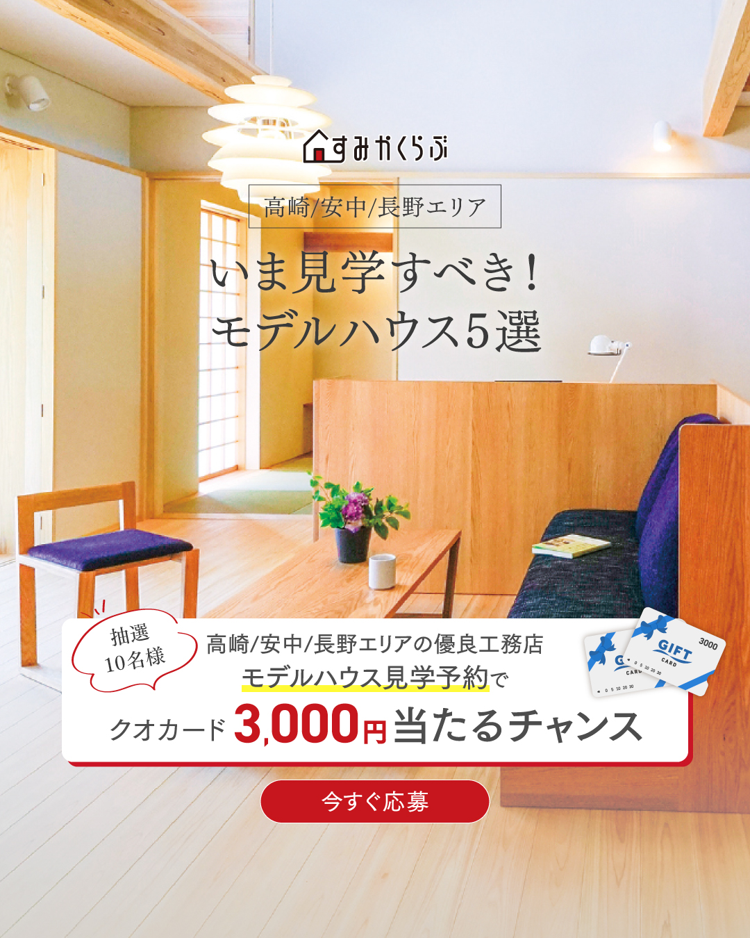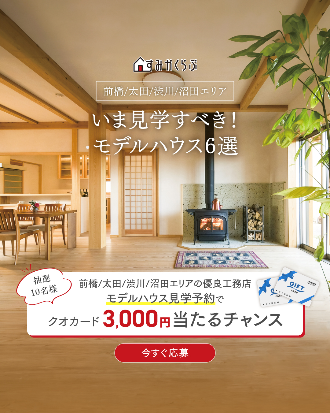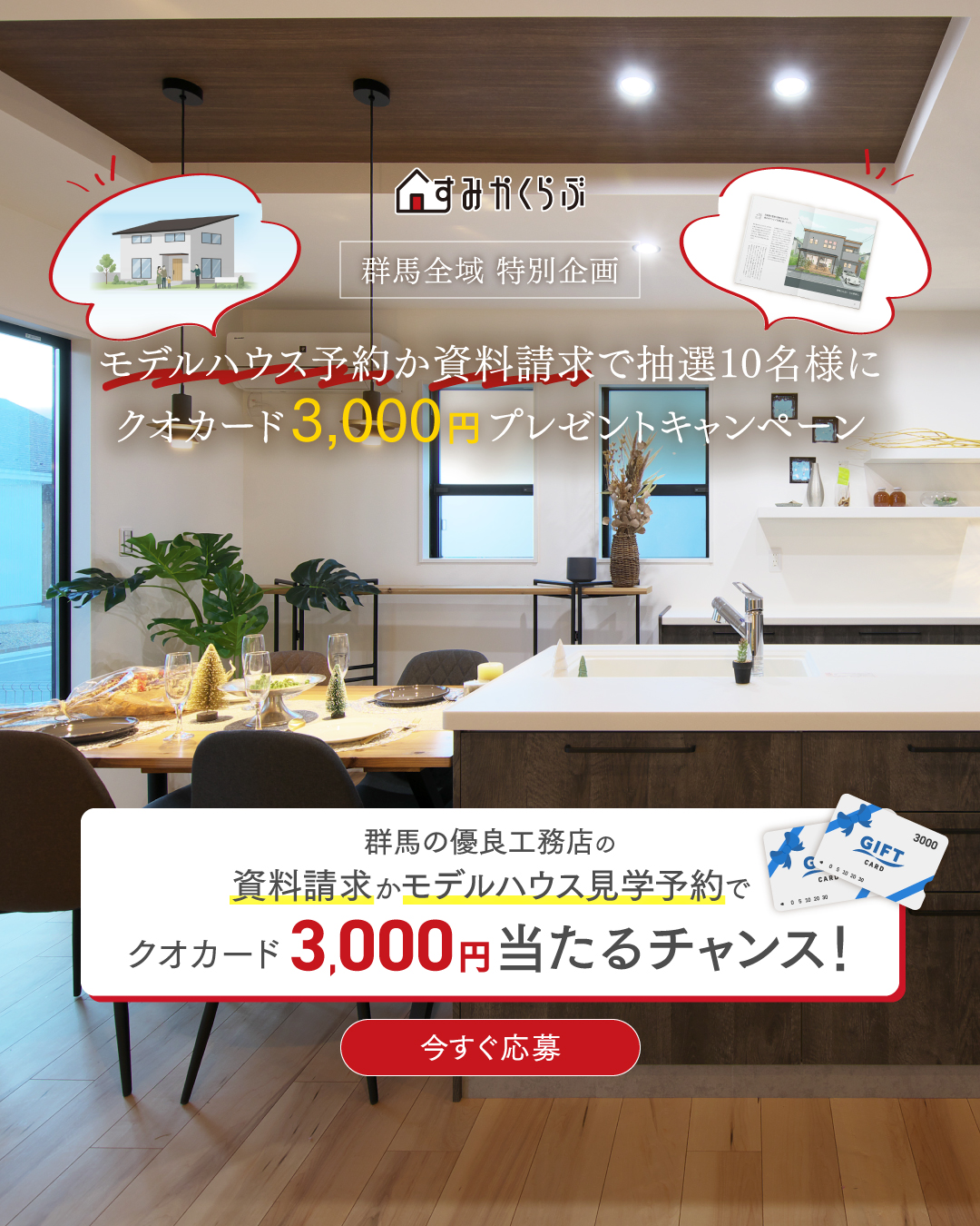 期間に「こだわりモデルハウス11選」に来場予約、資料請求するとクオカード3000円(抽選10名)が当たるキャンペーンを開催します。