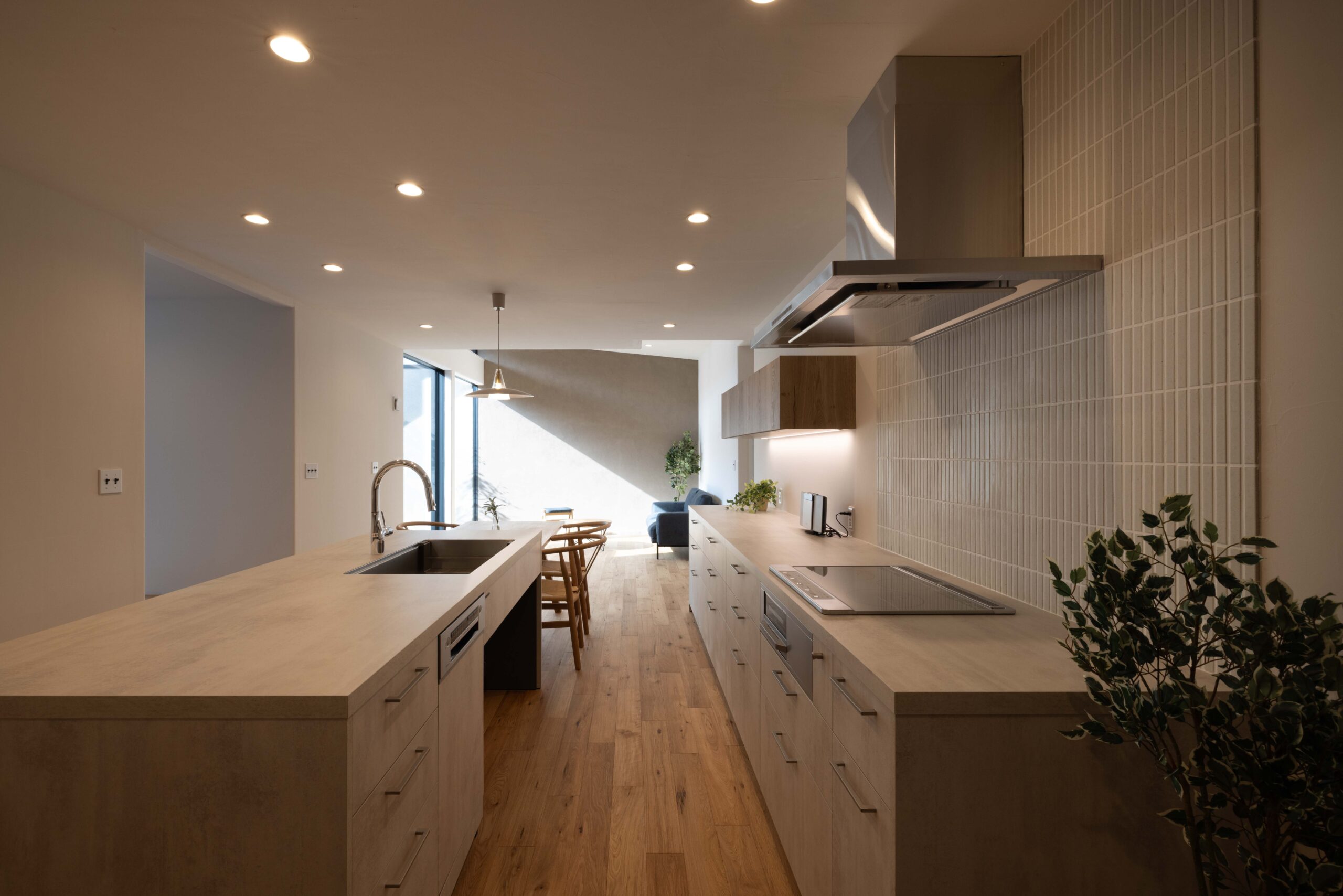 四季の移ろいを感じる中庭と一体となったリビングは、住宅地でありながら隣家を気にせずカーテンの要らない暮らしを実現。30代からの子育て世代をターゲットに、工夫を凝らした家事動線も見どころ。