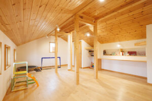便利な低天井の大型収納は子どもの遊び場。扉を閉めるとスッキリ