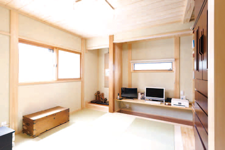 同社のモデルハウスでも、耐久性の高いケヤキを玄関ホールに、水に強いサワラを水回りにと、実際の使用例が見られる。また、床、壁、天井に加え、階段、建具、造作の家具にまで、熟練の職人技と細やかな気配りが見てとれる。