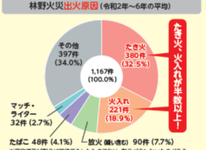 林野火災の出火原因は、「たき火」や「火入れ」などの人的要因によるものが多くなっています。乾燥・強風の日は、屋外での火の使用を控えて火災の予防をしましょう。