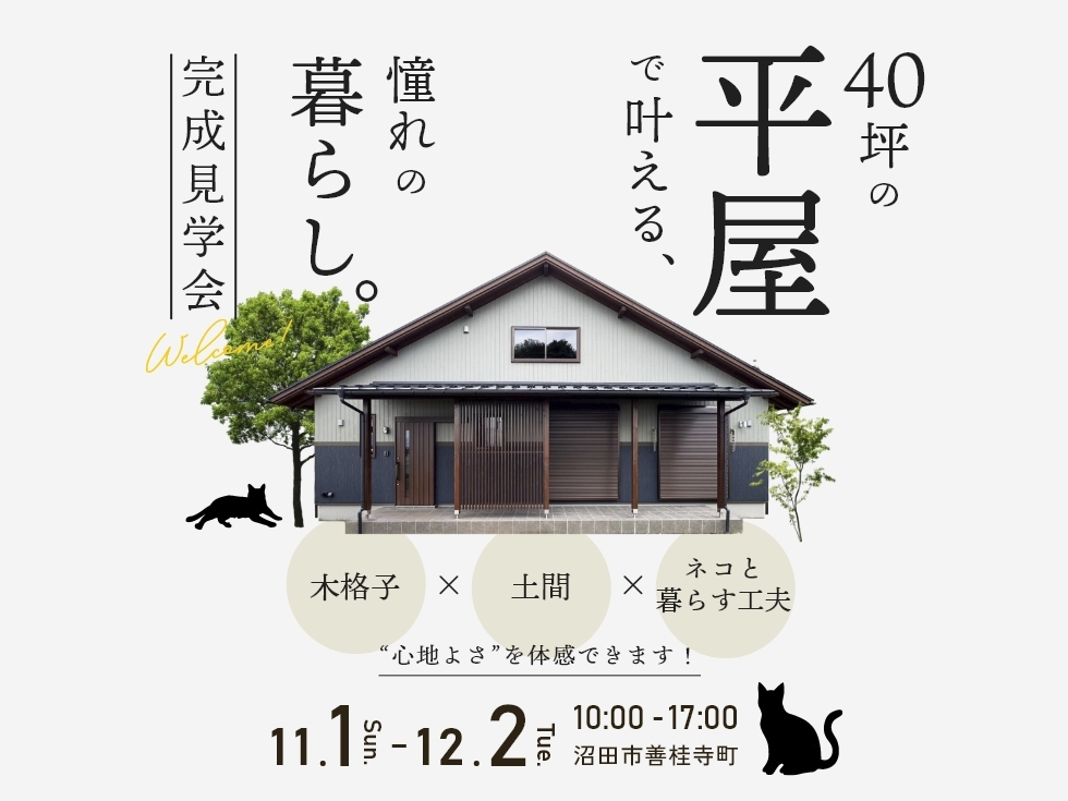 自然と調和する”和モダン”な暮らしを叶えませんか? ネコと暮らす工夫が満載の平屋づくりの家の見学会を開催します。 理想の暮らしを是非、会場で体感して下さい。