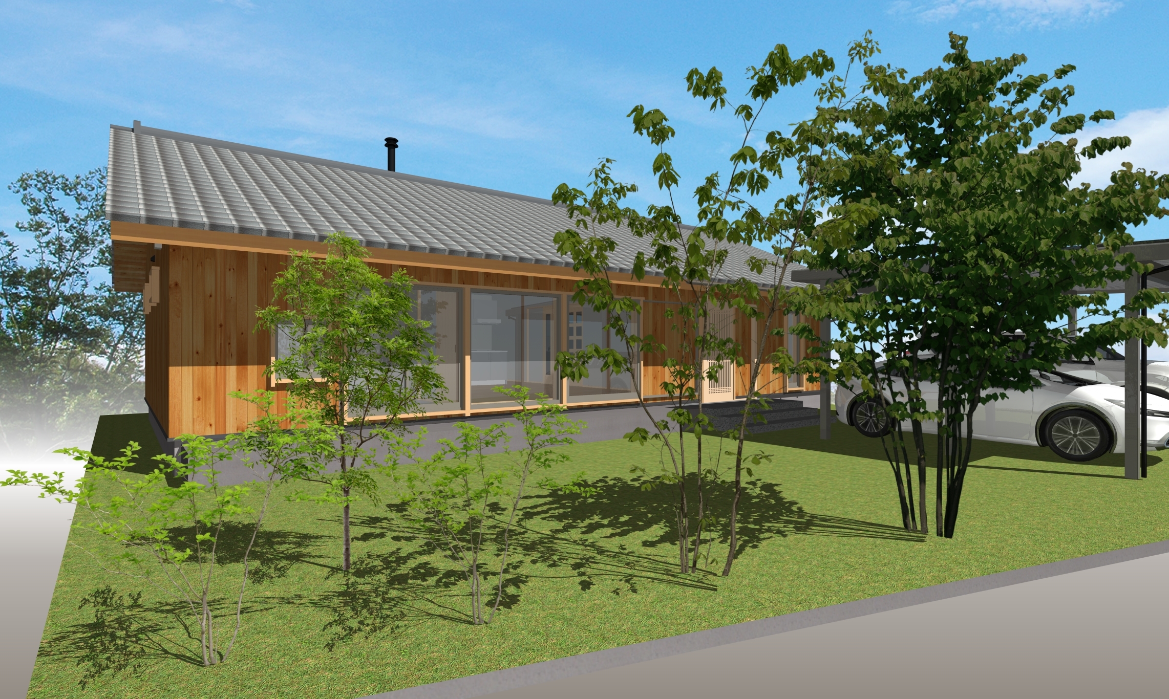 間口の広い敷地に建つ伸びやかな平屋。景観に配慮し、LDKとその開口部から眺める庭とのつながりを大切に設計した。お気に入りの石材と木材を適所に配置した内装も見所です。