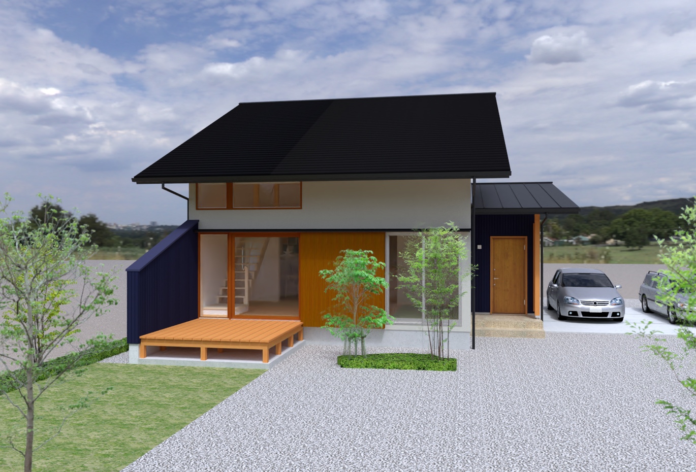 将来平屋として暮らせる大屋根の家。大屋根(への字屋根)+αな二階建てで、大きな吹き抜けと二階の窓から差し込む光で開放的で明るい空間が魅力です。ぜひご覧ください