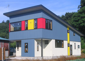 ライフスタイルや家族構成の変化にあわせて、間取りを自由に変更することができる家です。2階と天井の高低差を生かしたロフト風のミニスペースや、段差のある床、吹き抜けにかかるブリッジなど、遊び心あふれる設計です。室内の楽しさをイメージするように、外観には赤・青・黄などの原色を使用しました。
